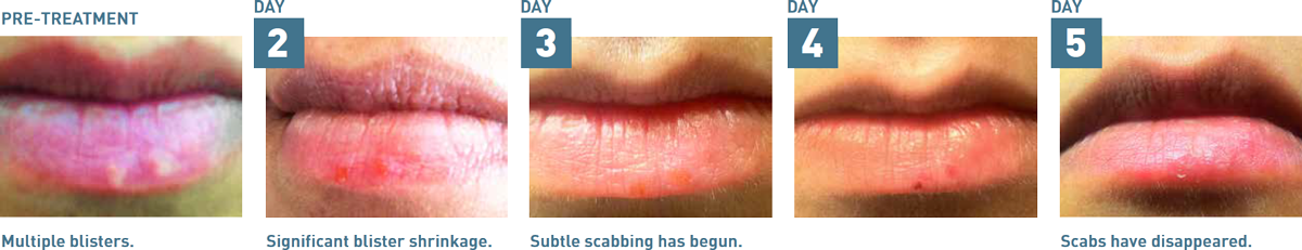 By Day 2 the blisters shrunk and were almost gone. On Day 4 scabs formed and on Day 5 they came off in the shower. Being an experienced user of other products currently on the market, I definitely recommend this product.